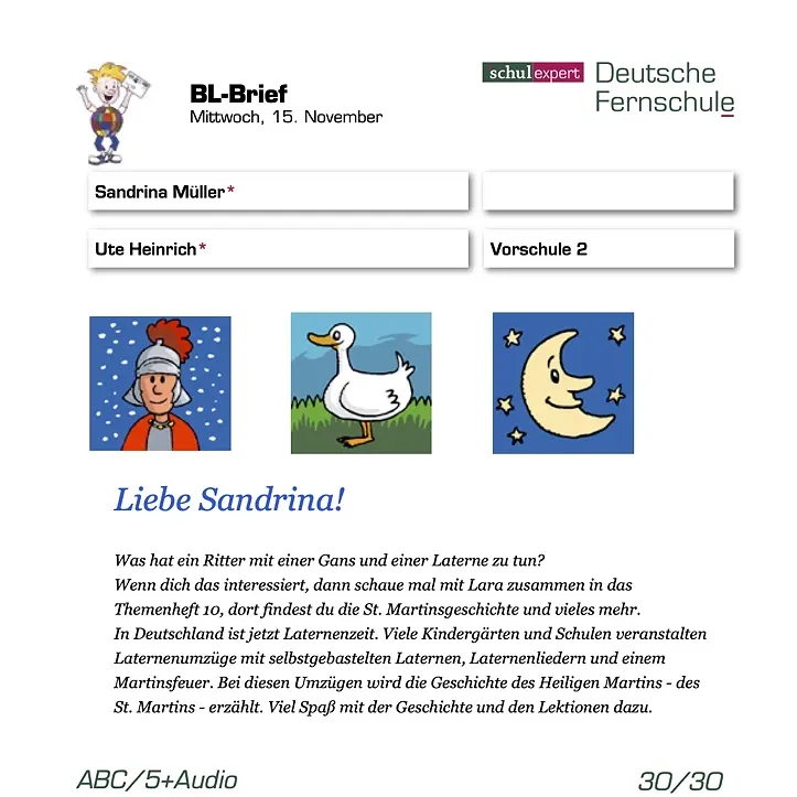 Sobald das erste Halbjahr eines Kurses bearbeitet wurde, verfasst die Lehrkraft einen Bericht. Darin richtet sie sich an die Eltern und fasst die Lernfortschritte des Kindes zusammen. Unsere Bezeichnung für solch einen Bericht ist „Elternbrief“.