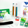 | 1 Schülermäppchen, 2 Schreiblernbleistifte, 2 Bleistifte HB Standard, 1 Set Buntstifte Dreikant, 1 Set Wachsmalstifte, 1 Füller (Rechts- oder Linkshänder), 12 Tintenpatronen, 2 Tintenkiller, 1 Lineal, 1 Dosen-Doppelspitzer, 1 Radiergummi, 1 Bastelschere (Rechts- oder Linkshänder), 1 Klebestift |