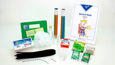 | 1 Doppel-CD zu den Lernheften, 1 Anlagenblock, 2 Schreibhefte, 1 Spiegel, 8 Plastik-Teelöffel, 16 Wackelaugen, 1 Päckchen Pfeifenputzer (10 Stück), 1 Igelball, 1 Prickel-Set, 1 Rolle Kraftband, 50 g Erbsen, 2 Päckchen Zahnstocher, 1 Nagel, 1 Tüte Kresse, 10 g Watte, 5 Stoffsäckchen, 5 Plastikbecher, 1 kleine Flasche, 1 Flaschendeckel, 1 Lichterkette, 1 Rolle Transparentpapier, 1 Jo-Jo, 6 Spreizklammern, 2 Gummiringe, 1 Würfel, 40 bunte Chips |